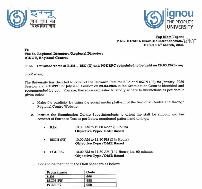 Notification for extension of last date for filling of online application form for Entrance test for B.Ed, B.Sc. Nursing(PB) (January, 2026 session) and PGDRPC (July, 2026 session)